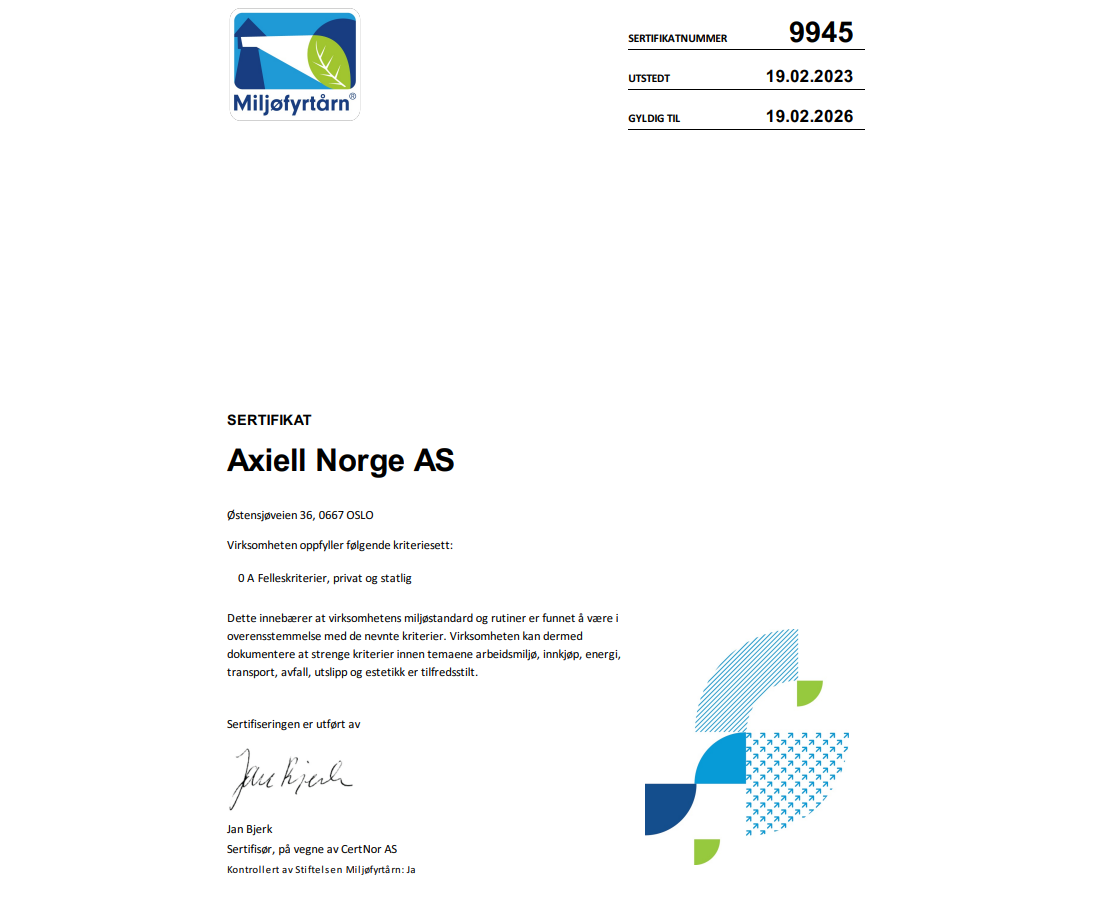 Miljøfyrtårn er Norges mest brukte sertifikat for virksomheter som vil dokumentere sin miljøinnsats og vise samfunnsansvar. Å være Miljøfyrtårn innebærer systematisk arbeid med miljøtiltak i hverdagen. Vi i Axiell Norge AS har vært miljøsertifisert siden 2020.