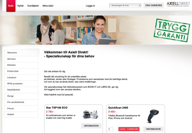 Kanske har du pengar över i årets budget? Passa på att bunkra upp inför nästa år med etiketter och kvittorullar eller skaffa en ny skanner och/eller skrivare. I webbshoppen har vi all utrustning du kan behöva på biblioteket. Och har vi det inte så hör av dig till Jonas Nilsson tel 046-270 04 61, kontakt@axielldirekt.com för en förfrågan.